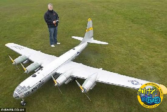 飞机的主人托尼是一个顾问工程师,来自英国东萨西克斯郡,今年46岁,但却有30年的飞机模型制作经验。他以美国上世纪50年代的轰炸机——波音 B-50超级空中堡垒——为原型,按7:1的缩小比例,在自家车库里面陆续花了2年时间、8000英镑制作完成了这架无线电操纵的模型飞机。虽然是模型飞机,但它翼展约6米,重达45公斤,在通过英国民航部门测验后被列为轻型飞机,并获得了飞行执照。