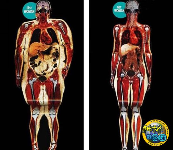 体重增加几磅,从外表看可能并不明显,但是在精确分析它对人体造成的破坏时,却会发现很大不同。从这张扫描对照图片上,你可以清楚地看到超重给器官、骨骼和肌肉造成了什么后果。