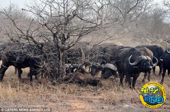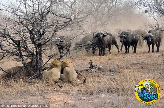 3只年轻的狮子穿过枯萎的非洲灌木丛,跟踪一群非洲岬水牛一段时间后,最终努力击倒了一头小牛犊,并准备把它杀死后好好地美餐一顿。但它们却忽略了这只猎物愤怒的亲戚——300头非洲岬水牛。这些令人难以置信的照片显示了1500磅(680公斤)重的大水牛是如何赶跑狮子,然后想尽办法让这只小牛犊苏醒过来的。