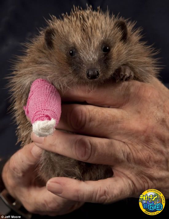 腿上包着粉红色纱布让这只受伤的小刺猬看起来鲜亮夺目,但是面对照顾自己的人们,它依旧露出哀怨的表情。现在,它是英国白金汉郡圣蒂基温克尔斯野生动物医院的贵客。