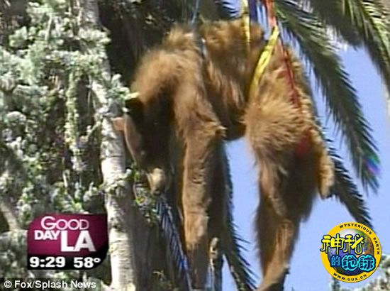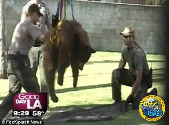 此次怪异的营救行动发生在美国加州奥克斯纳德的圣克拉拉墓地。当时,这只灰熊爬到一颗30英尺(约合9米)高的树上,结果就下不来了。在加州渔猎部门工作人员的参与下,消防队员首先用麻醉枪对其进行麻醉,而后利用营救设备让黑熊重回地面。