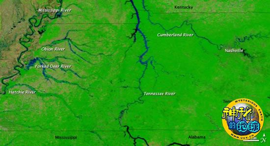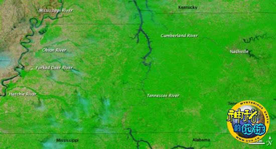 通过对两幅图片的对比,可以明显发现每一个水系的洪水泛滥情景。在雨后所拍摄的图片中,出现了无数膨胀的小溪,这些小溪在4月29日的图片中是看不见的。与4月29日的图片中情形相比,田纳西河、坎伯兰河以及它们的支流,到5月4日时明显变宽了许多。在西部,奥比昂河、福克德尔河以及哈齐河也明显膨胀。