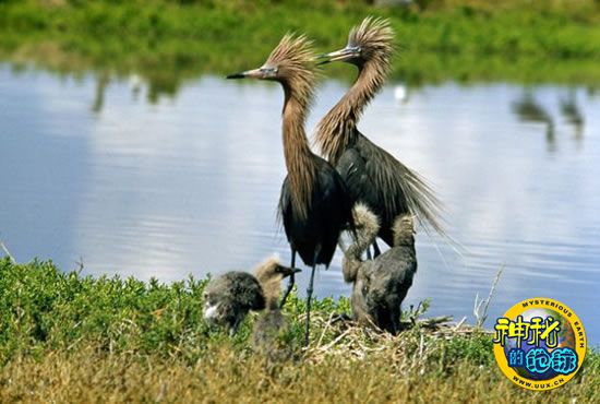 据新奥尔良市奥杜邦动物园的李-舍恩介绍,棕颈鹭应对墨西哥湾溢油事故的能力可能比鹈鹕强,因为它们是螳过浅水而非漂浮在水面,羽毛上粘的浮油应该更少。照片中是一对棕颈鹭领着幼鸟在河边徜徉的镜头。