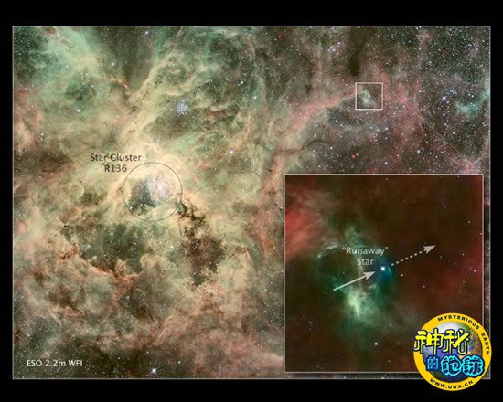美国宇航局/欧洲航天局“哈勃”望远镜新安装的宇宙起源光谱仪(以下简称COS)对这颗速逃星进行了3次观测。观测获得的线索以及所作分析显示,这颗恒星离开家园后可能已经穿行了大约375光年。它的家园可能就是一个被称之为“R136”的巨型星团。