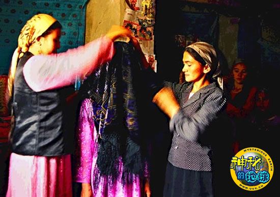 克里雅人的婚礼隆重热闹。男女青年自由恋爱,婚姻大多自主,但只能在沙漠村、部落之间选择。大漠共有一百多户居民,户与户之间距离少则几公里,多则二三十公里,大多数彼此沾亲带故。若有结婚嫁娶,得提前发邀请通知。形式是用一张小纸条逐户传递,因此,需提前半个月就发出。结婚时通常要热闹三天。有一天,我们连续访问四户人家,却有三户门户敞开,家中无人。后来得知,是亲戚家即将办婚事,他们都去看热闹了。维吾尔族翻译说:“这里夜不闭户,路不拾遗,房门根本不用上锁。”