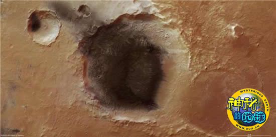 在图片的中心,近50公里宽撞击坑的底部覆盖着黑色物质,这些黑色物质类似火山灰,主要是由辉石和橄榄石等矿石组成。这些黑色物质捅破后露出一些“小堆”,可能是由更耐磨的材料组成。“小堆”周围的柔软物质已经被侵蚀并被东北风从撞击坑中吹走,在周围环境中形成黑色条纹。