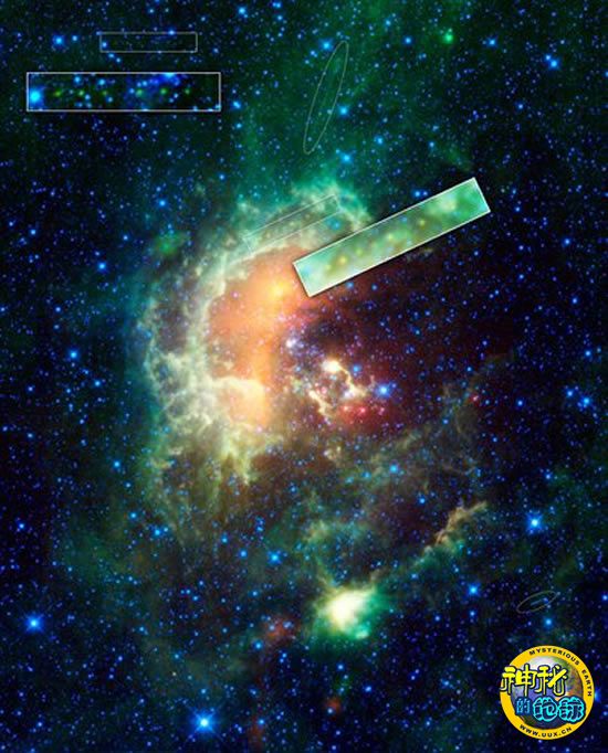 图片中的1719 Jens小行星呈现为黄绿色斑点,像串在一起的珍珠,犹如在五彩斑斓的蝌蚪星云上撒上了胡椒粉。图片中有一个特别显示的小方块,其中显露出另外一颗小行星。WISE还可以探测到其轨道上空的两颗卫星,在“拥挤”的图片中,卫星呈现出淡淡的绿色轨迹。