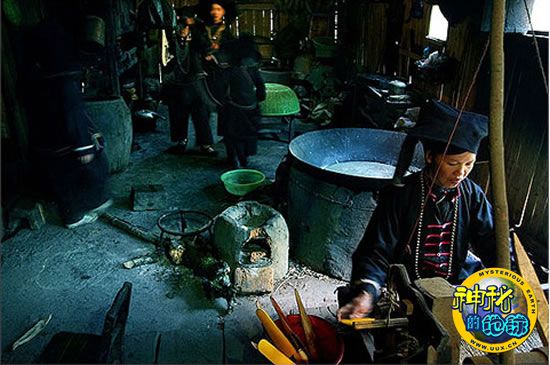 时至今日,那坡黑衣壮仍保存着传统的蓝靛染织工艺,其文化内涵非常丰富,黑衣壮自种、自织、自染、自穿,是地地道道的民族文化。在弄文屯,有一块埋藏得很深的天然石块,古代村民将石块凿成一个染井,这是弄文屯最古老的蓝靛染井,每到蓝靛收割季节,全村人轮流将收获的蓝靛枝叶沤泡在这口染井里,现在这口石井已干涸,但井壁上仍遗留有一层厚厚的蓝靛色。在长期的生产劳动中,黑衣壮总结了一整套蓝靛染色的经验。在弄文屯家家都有纺织机和用石头凿成的染缸,织出的布要用蓝靛浸染、漂洗数十次,再用牛胶、猪血煮染、漂洗后晾干成黑布,最后还要经过浆衣、用棒槌捶打多次,才能制出质地结实、平整、黑亮的成品布。这一过程充满了黑衣壮特有的生活气息和传统习俗的诗情画意。栏杆上晾晒着一条条蓝靛布,蓝靛的清香散发在空间,蓝靛染织文化的氛围很浓。黑衣壮的蓝靛染织工艺,不但是黑衣壮的文化遗产,同时也是中华民族甚至是全人类的文化遗产。