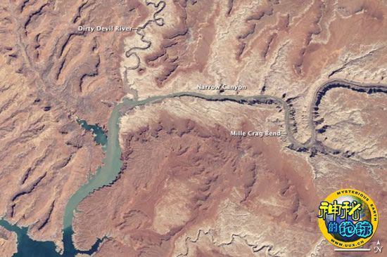 美国“陆地5”号卫星2010年4月7日拍到这张图片,它显示的是鲍威尔湖的东北部。科罗拉多河从米莉悬崖弯曲处(Mille Crag Bend)流往这里,最后汇入鲍威尔湖。在狭窄山谷(Narrow Canyon)的西端,"脏魔河"(Dirty Devil River)在该湖的北部与之交汇。由于该水库的北部突然急转弯,水里的沉积物在这里混合在一起,沉入水底,使这里的水变成绿色,下游的水变成深蓝色。2010年的水位比10年前同一时期的水位更低,但是水位最低的一次发生在2005年。