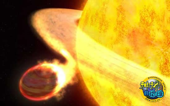 科学家在2008年发现了WASP-12b行星,它在御夫座星群中,距离地球约600光年,大小是地球的300多倍。它的质量比我们太阳系中最大的行星木星大40%。它距离自己的母恒星非常近,围绕母恒星一周仅需24小时。天文学家虽然知道恒星会吞掉距离它太近的行星,但是,这种现象能如此清晰地观察到还是第一次。