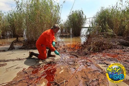 4. 海洋生物学家在密西西比河上检查被冲上岸的石油。