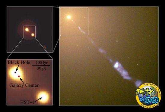 研究人员还排除了以下可能性:这个黑洞移位是由M87里的其他星系和球状星簇共同产生的引力造成的。因为它们共同产生的引力,只能使这个黑洞位移0.3光年。一种更切合实际的可能性,是M87喷出的物质流(延伸范围超过5000光年)把这个黑洞从星系的中心推出来。对银河规模的星系来说,这种物质流的力量非常小,但是如果这种物质流的年龄有1亿岁或者更大,它就能很好地移动黑洞。巴赫尔多表示,要想让这个黑洞位移那么远,以前这个物质流的质量必须更大。
