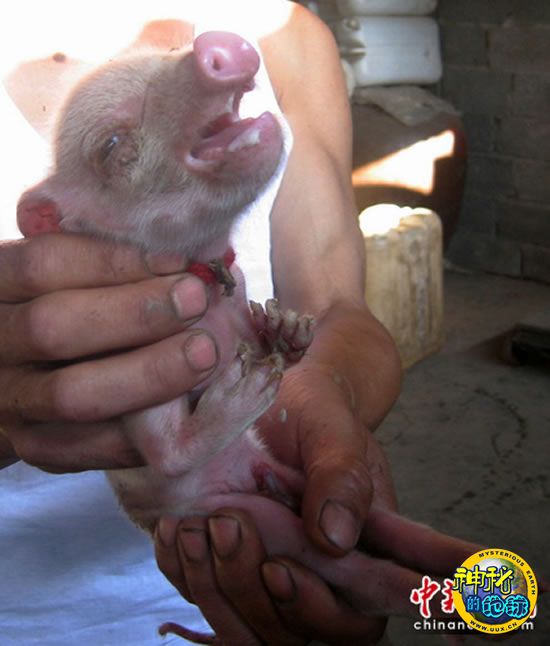 在张朝龙家,记者目睹了这只 “明星猪”的风彩。由于小猪才出生不久,脐带还未完全脱落。初看上去,它与其它小猪并无任何差异,但当主人将其抱起时,记者吃惊地看到,小猪两只前腿呈抱状抱于胸前,脚掌酷似人的手掌,各有五个小指头,连指甲都与人的指甲有些相似。记者仔细观察,其掌心还有清晰的掌纹。再看其后脚,却与一般猪脚没有任何区别。