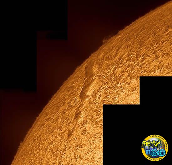 在英国摄影师皮特·劳伦斯5月17日从地球拍摄到的这张照片中,一个奇特的扁平太阳暗条似乎成了太阳表面的一道“疤痕”。在这张照片拍摄前数天,太阳爆发日珥。日珥是在太阳表面上方但仍处于太阳磁场内的一个非常密集的冷气区。日珥沿日轮边缘出现,在广袤黑暗的太空映衬下,日珥看起来像明亮的光环。但是,在太阳旋转时,我们能看温暖明亮的太阳表面映衬下的日珥,它们看上去像黑色的“裂纹”(如图),也被叫做“暗条”。