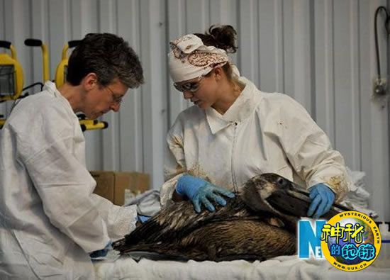 正在接受救助的这只褐鹈鹕原本栖息于格兰德岛湿地,距“深水地平线”钻井平台漏油点约193公里。两天前,野生动物搜救队员发现它浑身沾满原油,躺在湿地里。