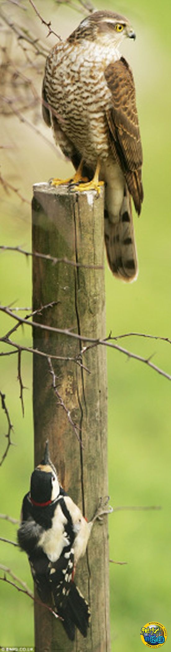 一分多钟后,由于没有发现猎物,雀鹰失去耐心飞走了。罗伯特-福勒家住约克附近的克斯登代尔,他在自家花园中捕捉到这一幕。在此之前,福勒看到这只雀鹰抓住了啄木鸟,只是在挥舞翅膀驱赶另一只猛禽时,让啄木鸟乘机溜走,飞到木桩的下方躲避。