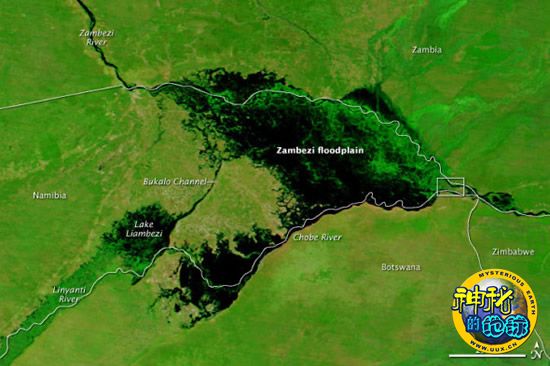 赞比西河流经卡普里维地带(Caprivi Strip),一个在博茨瓦纳和赞比亚之间狭窄的三角地带,是连接纳米比亚和赞比西河的陆地通道。夹在赞比西河和乔贝河之间的是卡普里维地带的西端,在每年3、4月份的洪水季节,这里经常被洪水淹没(第一幅照片)。下幅伪彩色照片由美国宇航局的Terra卫星上的中分辨率成像光谱仪利用红外线和可见光拍摄而成,照片上河流区域显示为黑色。