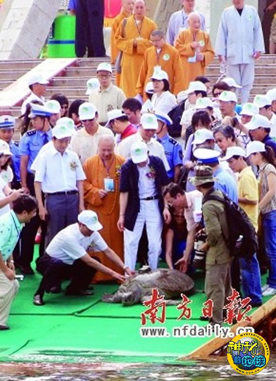 海龟放生是本届放生活动的最大亮点。昨日上午9时半,来自惠东港口海龟国家自然保护区、约110多岁的成年海龟“南沙”,第一个从阳江海陵岛的南海放生台游向大海,农业部部长韩长赋、广东省副省长李容根等嘉宾亲自为它送行。