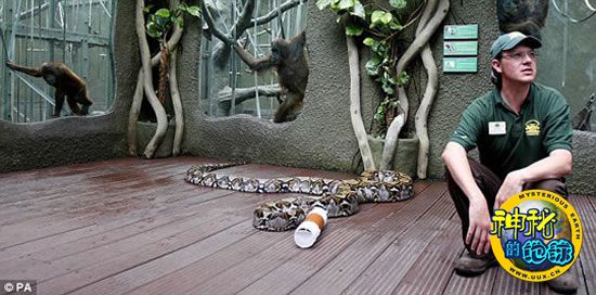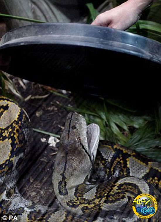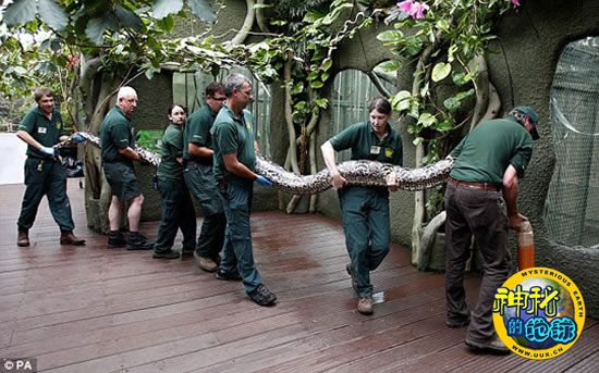7米长巨蟒看医生 来源: 蜘蛛网 时间:2010年6月13日 13:28 切斯特动物园的7名工作人员,抬着长近7米的巨蟒巴里去做健康检查 激动的巴里露出它的尖牙,工作人员使用垃圾箱盖子分散巴里的注意力,然后将其眼睛蒙上,这样它才安静下来 这种巨蟒通常以啮齿动物、哺乳动物以及鸟类为食,有的也吃灵长类,甚至是人类 雌性巨蟒每次可产下60到100只卵,70天到90天即可孵化 尽管很多人在看医生的时候都有恐惧情绪,但也不至于要人抬着去。可是英国切斯特动物园中的一条大蟒蛇去做健康检查时,却需要动用7名动物园工作人员。 国际在线(杨柳) 上一篇 下一篇 TAG: 巨蟒