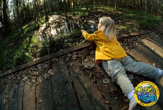 路易斯安那州的简-拉斐特国家历史公园及保留地,一名小女孩爬在木板路上玩耍。这座公园命名于简-拉斐特,拉斐特原是一个法国海盗,在1812年战争中向美国提供了帮助,由此在美国被视为英雄。据美国国家公园管理局介绍,简-拉斐特国家历史公园及保留地恰好处于墨西哥湾漏油流经的路线上,其巴拉塔里亚湾尤其易于受到冲击,因为它经由多条水道与墨西哥湾相连。