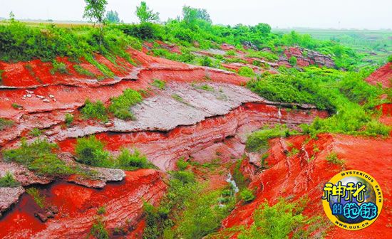 6月13日下午,在莱阳市国土资源局金科长的带领下,记者来到了金岗口村恐龙化石的1号发掘点。1号发掘点位于一个山沟里,地势北高南低,中间凸起的部位被一块巨大的塑料纸覆盖 。南侧露出褐色、绿色和红色不同颜色的地层。1951年,中国古生物学奠基人、恐龙研究之父杨钟健及地质学者与山东大学地质系合作,在莱阳发掘出新中国第一具最早、最完整的棘鼻恐龙化石骨架,他将其命名为“青岛龙”。
