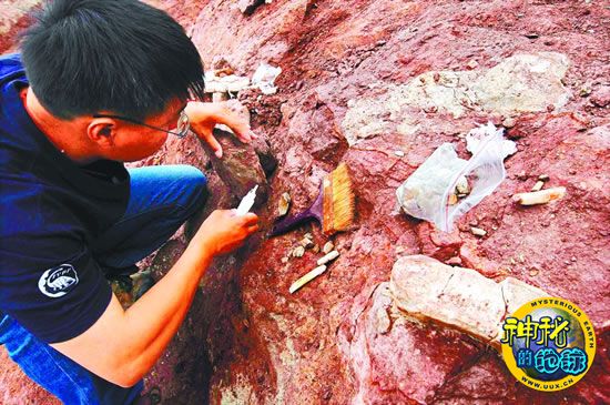 据于世明介绍,4月24日上午,他和16岁的儿子于振海去放羊,路过村东一处地头时,突然在泥土中发现了恐龙骨骼化石。“有一块很大的恐龙大腿转轴,还有一些零碎的化石,都有二三十厘米长。”于世明说。
