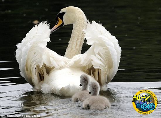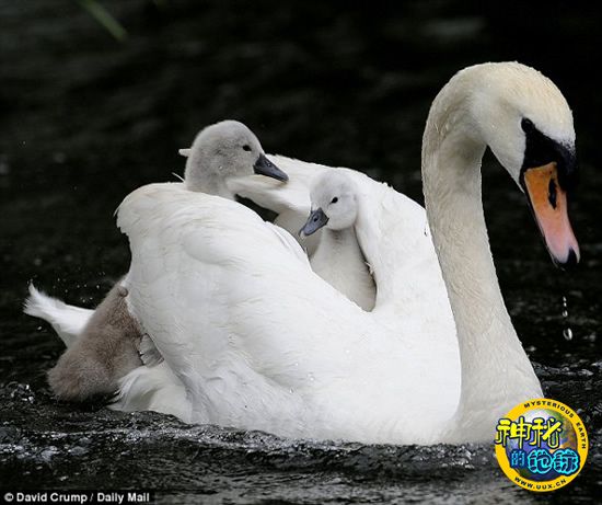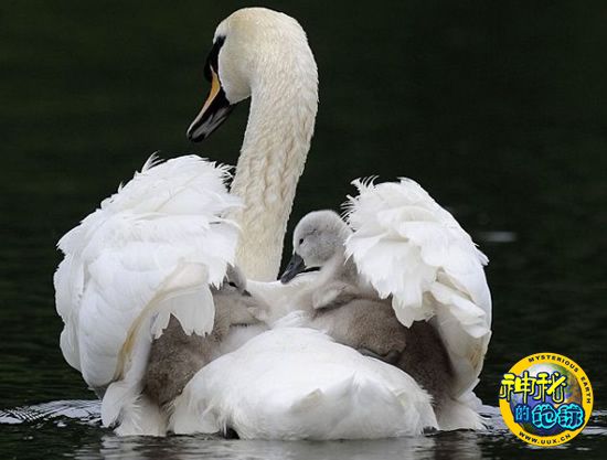 对于还不特别熟悉水性的天鹅宝宝来说,学习游泳可是一项辛苦的任务,幸运的是,它们的妈妈一直陪伴在身边,帮助它们。照片中这位天鹅妈妈显然对孩子比较溺爱,在教两个小家伙学习在池塘中滑行的技术之后,它还让孩子们跳到它的背上休息。