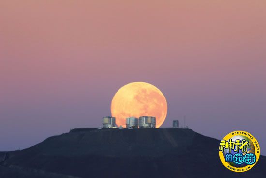在这张难得的照片中,月亮似乎正处于甚大望远镜背后的高地之上。欧洲南方天文台的官员解释说,其实它们之间的真正距离要远得多。欧洲南方天文台天文学家高登-吉列特在距离甚大望远镜大约14公里的位置,利用500毫米的长焦镜头拍下了这种“月径幻觉”景象。
