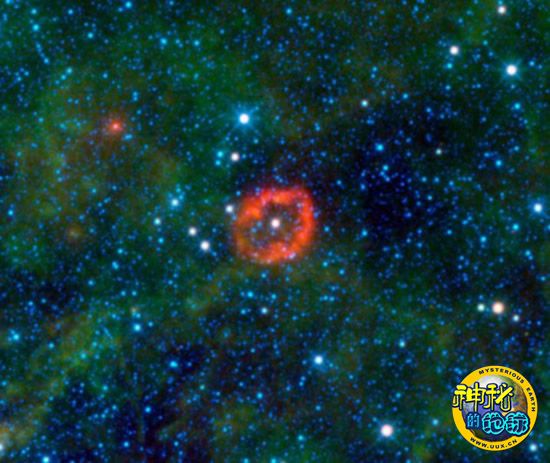 这颗恒星(红圈中心的白点)其实是银河系中质量最大的“常驻居民”之一。像这样的天体都被称为“沃尔夫-拉叶星”(Wolf-Rayet star),是以最早发现此类天体的天文学家的名字命名的,它们使得太阳看上去像是“侏儒”。广域红外探测器于2009年发射升空。