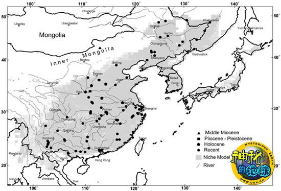 伍氏青鱼化石分布点(三角形)和青鱼生态位模型(灰度阴影区)
