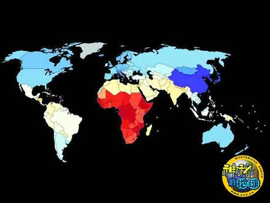 在这张地图中,覆盖着紫色的国家具有最高的平均IQ,而覆盖着暗红色的国家则IQ最低。(图片提供:Wikimedia Commons)