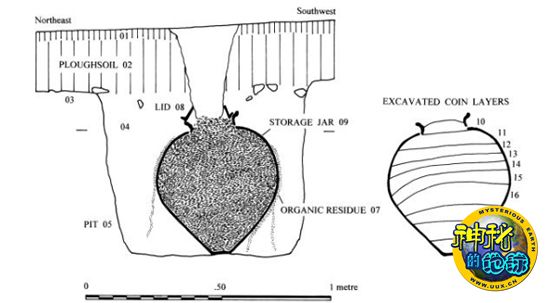 图解显示罐埋于地下的方式,小图显示古钱币的不同层次。