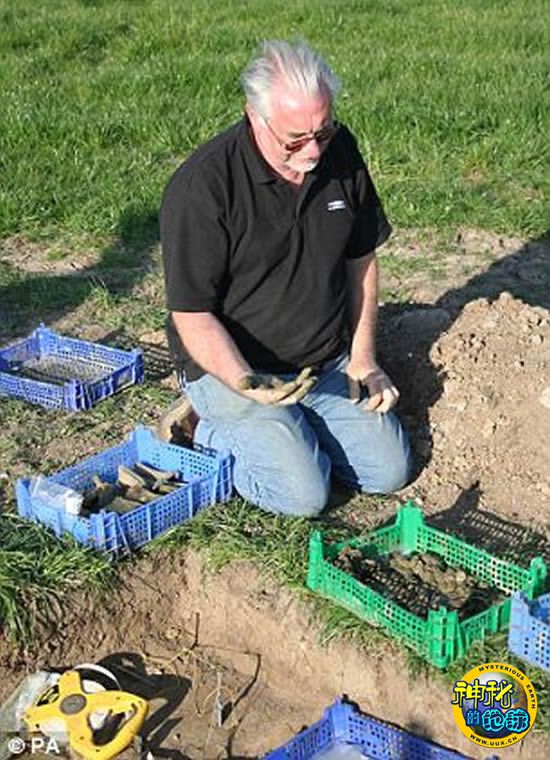 手上粘满泥土,大卫·克里斯普跪在他发现钱罐的地上。