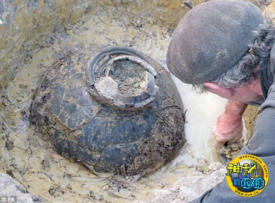 考古学家在英国萨默塞特郡弗洛姆斯镇附近挖出这个古钱罐。