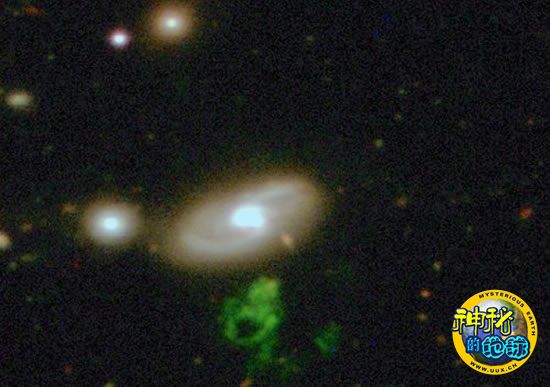 从图片中可以看到,在螺旋星云上有一个奇怪的蓝绿色亮点,在图片下方还有一片绿色光晕。科学家研究认为,这片绿色光晕可能是一个放射物猛烈爆炸后的残留物,又十分像一个类星体的回光。但科学家始终无法弄清这个光焰产生的原因。最近有新证据显示,这个螺旋星云的中心有一个超重黑洞。这个超重黑洞只有不断的吞噬它周围的大量物质才能存活。当物质被吞噬时,相应的会发出带光的放射物圆锥体,从而使周围的气体云被照射出绿色的光。