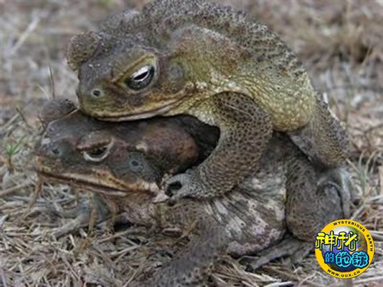 科学家发现雌性手杖蟾蜍通过吸气很容易使自己的身体膨胀起来,使趴在自己背上的雄性显得更小,最终终止性交配过程。