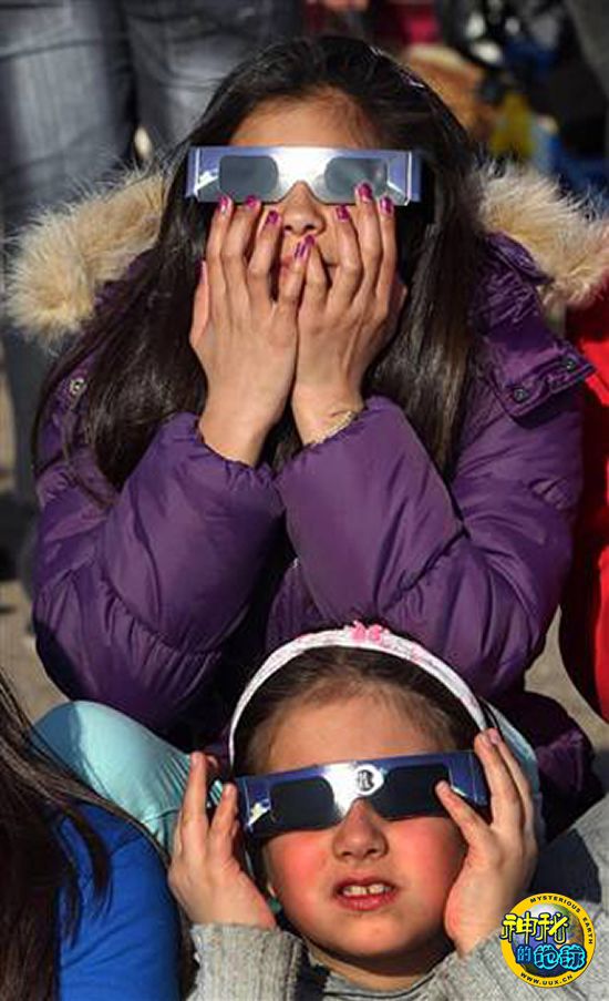 在智利西北部的科金博港,孩子们正在观测日全食。