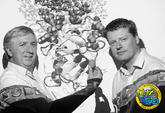 两名研究小组的科学家手拿鸡蛋在分子结构图面前