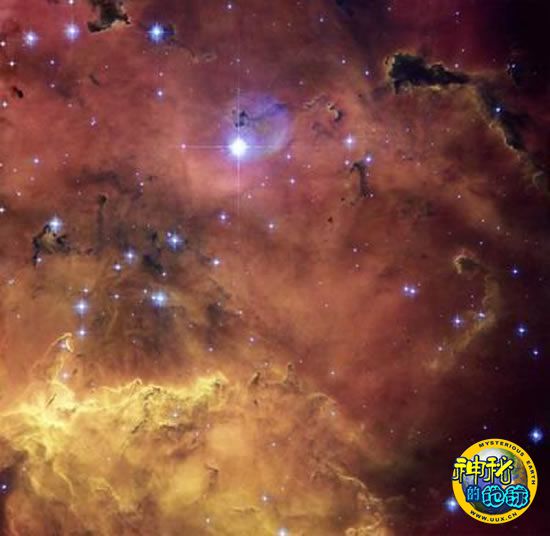 如图所示,NGC 2467星云呈现出粉红色和黄色,在星云中心位置,新生恒星释放紫外线对多数氢气进行加热。据悉,该星云距离地球大约13000光年,位于船尾星座南部。