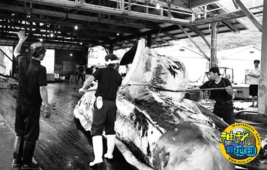 凌晨4点,《世界新闻报》记者来到了和田町被称为“解体场”的鲸鱼屠宰场。“解体场”位于海边的一个大空场上。记者看到,一条近10米长的鲸鱼正躺在岸边,一把带钩的捕鲸枪深深地扎在它的头部附近。