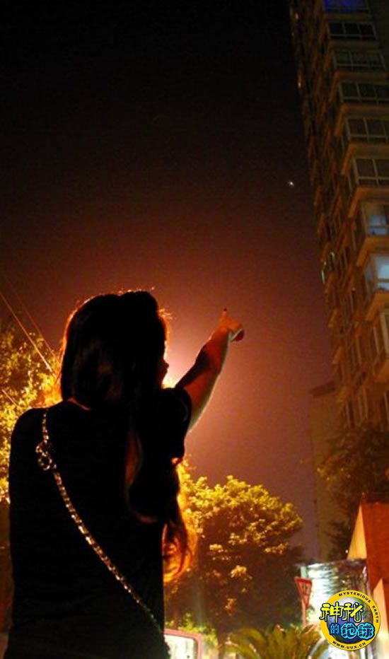 据家住该小区的梁女士介绍,当晚8时40分左右,小区QQ群有人在说小区上空出现了不明飞行物。家住32楼的她立即跑到阳台上观看。“真的有4个不明飞行物挂在我们小区上空。”梁女士兴奋地说,有3个发光体呈圆点,发出白色的光,光线呈十字形,这3个发光体呈品字形排列,一动不动。离它们稍微远点有一个黄色带着尾巴的发光体。