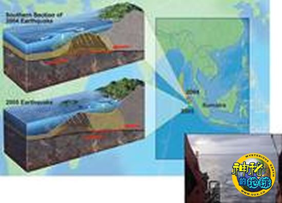 美国马萨诸塞州伍兹-霍尔海洋研究所的海洋地球物理学家Jian Lin对此表示赞同。他说,这篇论文给出了“有力的证据”,表明沉积层“对于地震引发的海啸具有重要的影响”。利用声爆(小图),研究人员分析了两次苏门达腊地震震源区的海底岩层特性。(图片提供: Nicolle Rager Fuller/National Science Foundation)