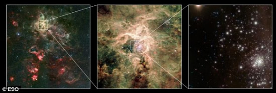 逐级放大,这显示了科学家是如何锁定这颗恒星的。发现超大质量恒星的位置就位于第三幅图的右下角
