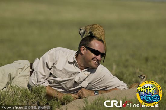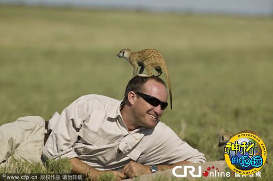 猫鼬在摄影师趴在地上时大胆地爬上他的头四处观望。