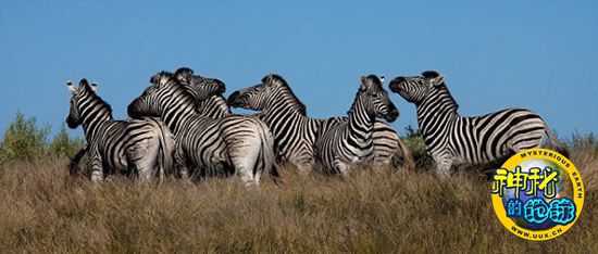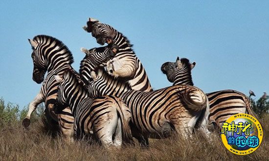 斑马聚集到一起,在炎热的非洲嬉戏打闹,它们呲牙裂嘴,露出凶相吓唬对方。