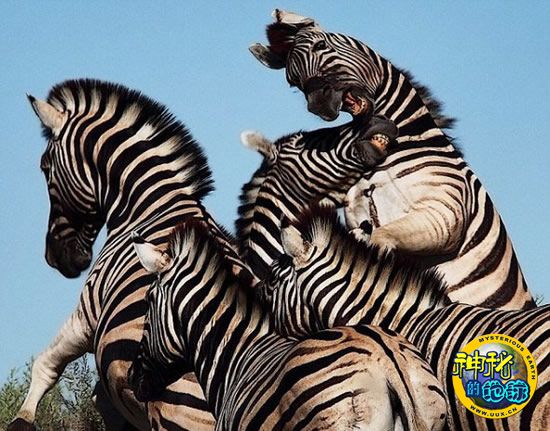 斑马一向都很温顺,不过它们也有嬉戏打闹的时候。本来斑马还在水边安静的喝水,不一会儿消除口渴的它们开始嬉戏打闹起来。它们呲牙裂嘴,露出凶相吓唬对方,甚至爬到彼此的背上。