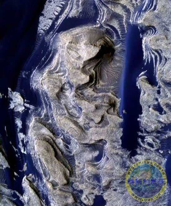 这张足以使人晕倒的照片是由绕火星轨道运转的一颗卫星拍摄的,根据2月17日《科学》杂志刊登的一项研究,火星层状岩石的裂缝中曾一度出现过水。如果从上面观察贝克勒尔陨坑,这些裂缝是清晰可见的——层状岩石的浅色和深色层“拼”成了这个大峡谷的墙壁。必须提醒读者的是,图片中的蓝色区域是广袤的沙丘而不是水。
