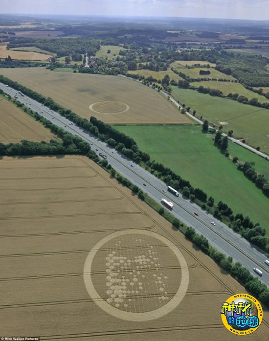 据英国媒体报道,在这条英国最繁忙高速公路上驾车行驶的司机们也许完全不会留意到身旁农田里出现的神圣图案。这里是M4高速公路靠近英国南部巴克夏郡汉克福德(Hungerford)的路段,在路的两边出现了两个麦田怪圈,看上去似乎是耶稣基督的脸。这两个怪圈几乎一样大,直径均为250英尺(约合76米)。其上描绘的图案和著名的“都灵耶稣裹尸布”上的图案有些类似。