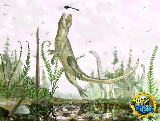 这张艺术概念图显示的是1.05亿年前,Pakasuchus利用细长的腿和柔韧性很好的背部弹跳起来,捕捉飞虫的画面。Pakasuchus可能是以小蜥蜴、昆虫和当时冈瓦纳大陆存在的少数原始哺乳动物为食。俄亥俄大学的论文联合作者南希·史蒂文斯在一份声明中说:“这种小型动物在食物链上占据着跟现代鳄鱼明显不同的位置。”鳄鱼序包括鳄鱼、短吻鳄、凯门鳄、马来鳄和与之相关的已经灭绝的种类。