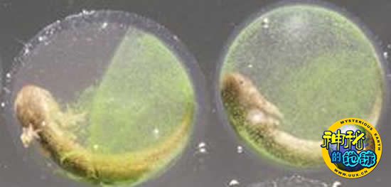 柯内还发现,成年雌性斑点蝾螈的输卵管内也有绿藻存在,那里也是胶状胞囊形成的地方。这个发现表明共生藻可能是由母亲通过胶状胞囊传递给下一代的。